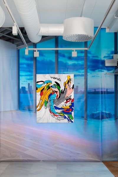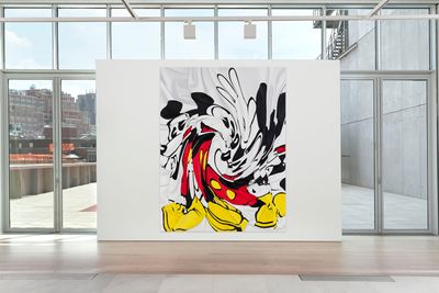 Since 2019, when she presented the sculpture “Pile” a mountain of cotton t-shirts printed as merch for rock concerts, political campaigns and other causes at Tate Modern, the artist has been working with and drawing inspiration from graphic t-shirts most recently creating hyperreal images in oil on canvas from photographs of T-shirts crumpled on the floor. Agents of commercialized popular culture and underground ephemera, cartoons and band logos are abstracted, amplifying the paintings’ existence as a commodities. In continuation of this series, which reanimates the static surface of the t-shirt, Disney’s cast of characters swirl forming a center point of enchantment, a hypotonic, added element of seduction.