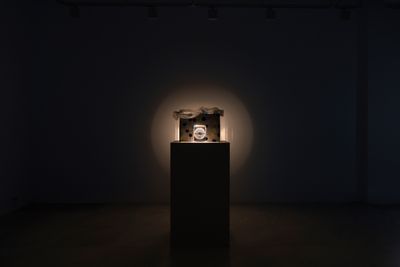 Four sculptures in the room are positioned in a row. Each sculpture consists of a static image projected onto the wall and its accompanying housed machinery of different compositions that sit on pedestals. Each sculpture follows its own logic of expression, utilizing narratives of daily environments and its hauntings.