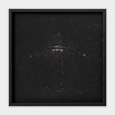 Hung in between the four sculptures, with two on either side, is a small, framed mezzotint print. Unconcerned with light, the barely there drawing is of a semi-circular magnet and its accompanying field of magnetite (Magnatite rendering 1, 2023).