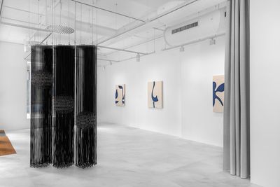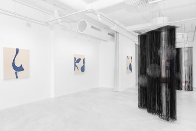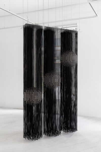 Known for colorful and large-scale, site-responsive works, LeWitt has previously explored modularity connecting works at the top to form relaxed sculptural gatherings out of individual elements. With Hanging Spheres, LeWitt debuts an entirely new body of work made from hand-cut black rubber and reflective steel beads. Suspended from the ceiling, these groupings of two (Hanging Sphere 40, 66.5, 2021) and three sculptures, (Hanging Sphere 75, 56.5 and 43, 2021) respectively produce an optical illusion when moved around. The numbered titles of these works refer to the height of the spheres in inches.